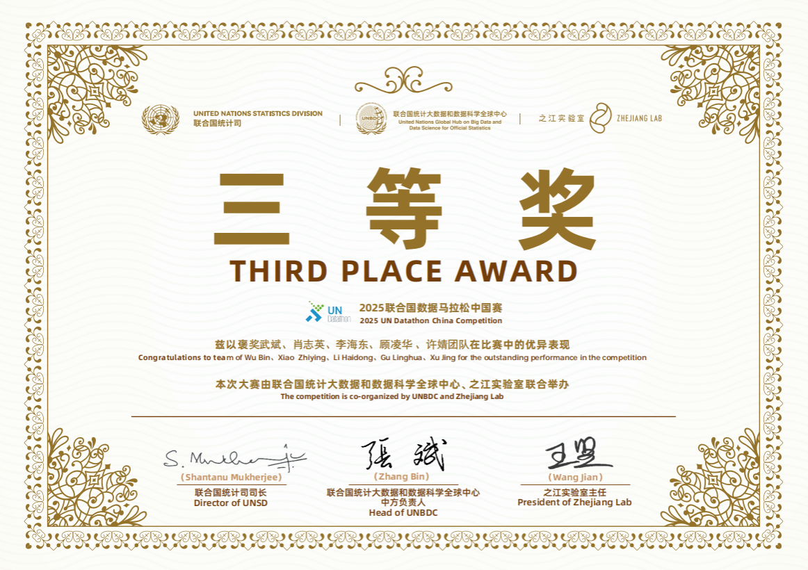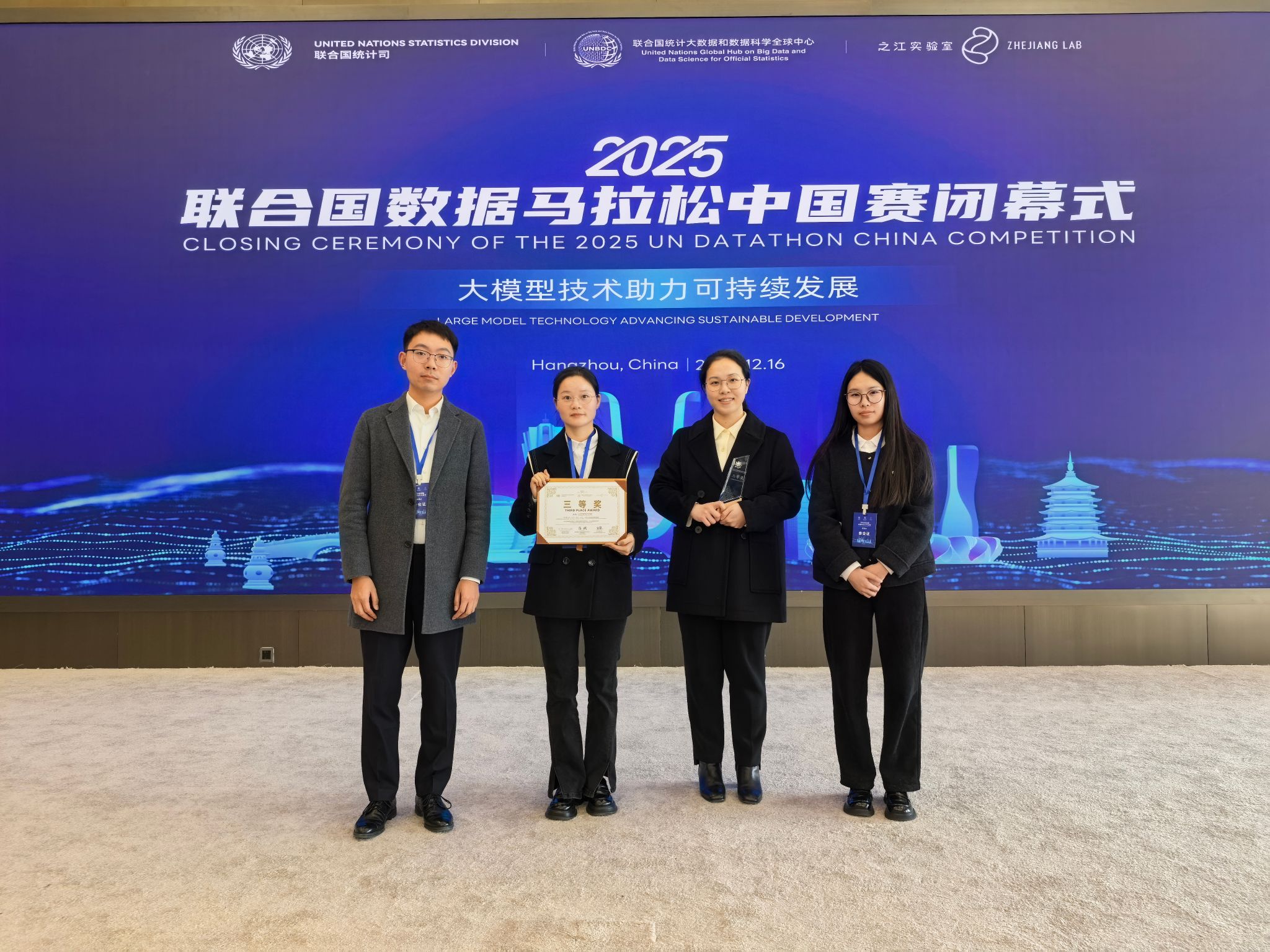 12月16日,由联合国统计司、联合国统计大数据和数据科学全球中心和之江实验室联合举办的2025联合国数据马拉松中国赛决赛暨闭幕式在之江实验室落下帷幕。统计系与舟山调查队联合组建的“数智金舟”队参与角逐,最终斩获三等奖。