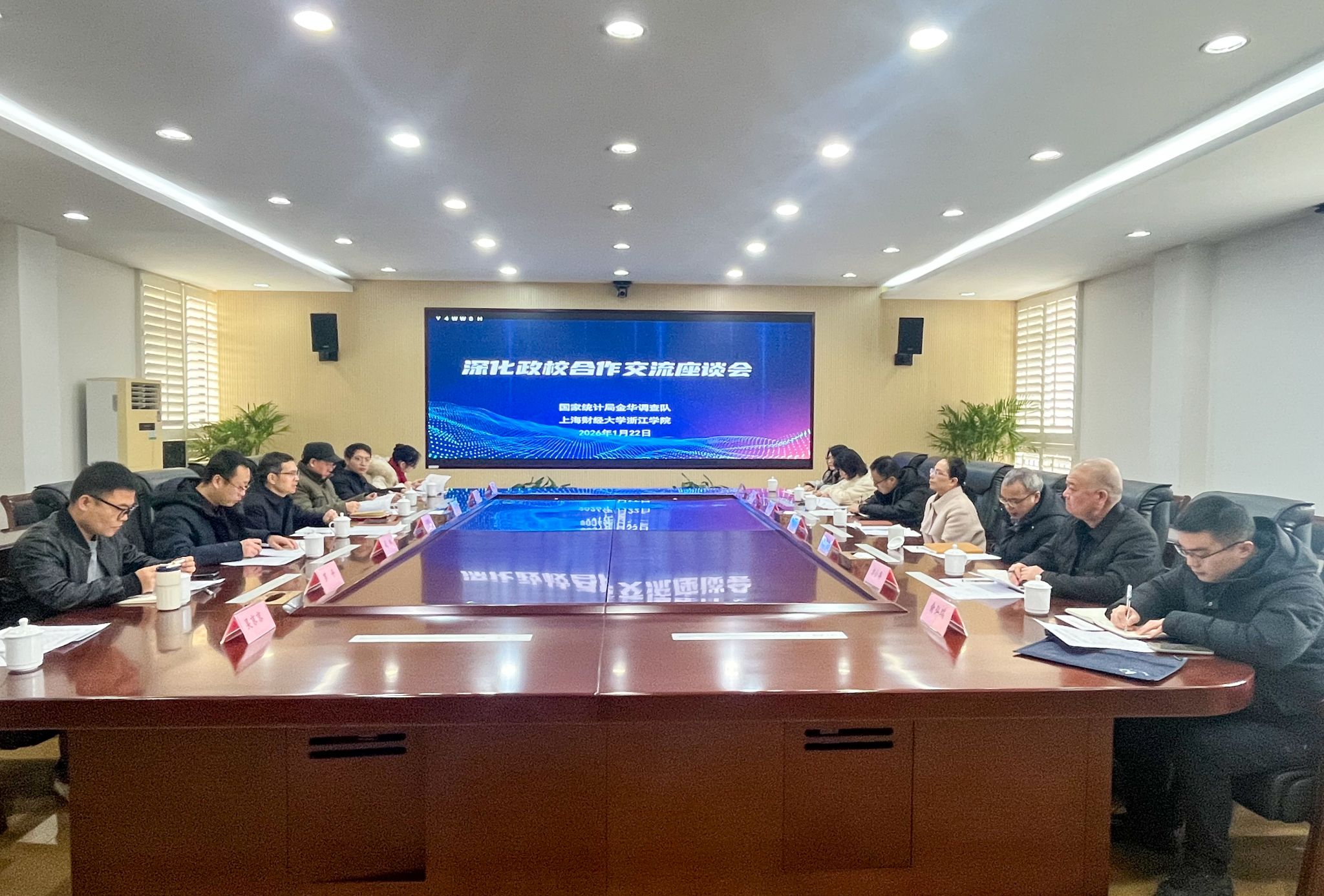 1月22日上午,国家统计局金华调查队党组书记、队长陈彤,党组成员、副队长张国民一行来我院访问交流,双方共同召开深化政校合作座谈会,共商协同发展新路径。学院院长江晓东主持会议,副院长邱风、双方相关处室、二级学院负责人共同参加。
