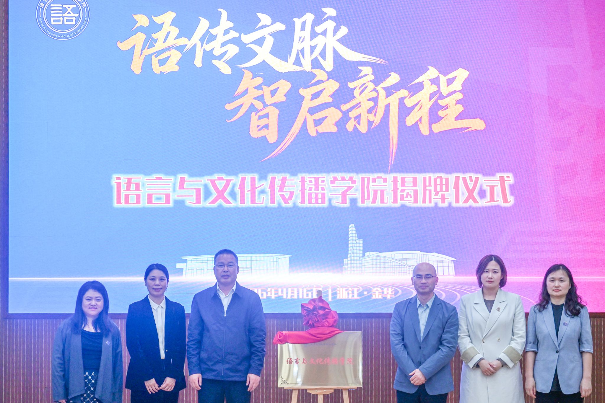 春风启新序,文脉谱华章。4月16日下午,我校在28-120报告厅举行语言与文化传播学院成立揭牌仪式。学校党委书记王建新出席仪式并为学院揭牌,党委委员、统战部部长徐玉芳,上海财经大学外国语学院副院长杨国静,浙江师范大学外国语学院首任院长、原外语系首任系主任陈昌义,浙江师范大学外国语学院教授、原外语系第二任系主任吴本虎,校内外专家代表,合作企业代表,优秀校友及全院师生代表齐聚现场,共同见证这一重要性时刻。揭牌仪式由学院党委书记、副院长朱漪漪主持。