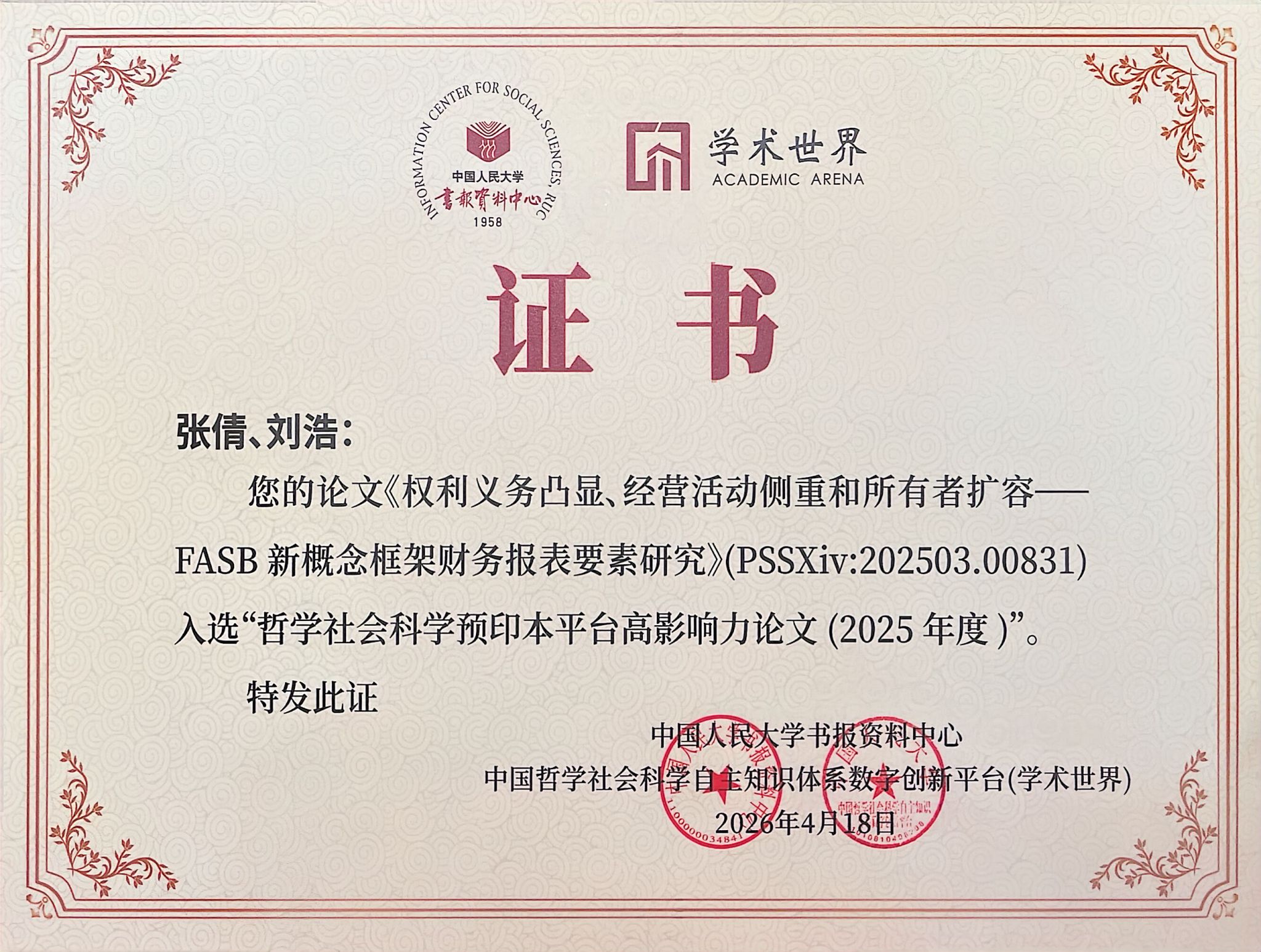 4月18日,会计学院、会计与财务研究中心张倩老师作为作者代表,受邀参加2026年中国人民大学复印报刊资料转载指数发布暨“人工智能+哲学社会科学研究”论坛。在此次论坛中,张倩老师与上海财经大学刘浩教授合作发表于CSSCI期刊《会计与经济研究》的论文:《权利义务凸显、经营活动侧重和所有者扩容——FASB新概念框架财务报表要素研究》,入选2025年度“哲学社会科学预印本平台高影响力论文”。此前,该论文已获人大书报资料中心《财务与会计导刊(理论版)》2024年第12期全文转载。