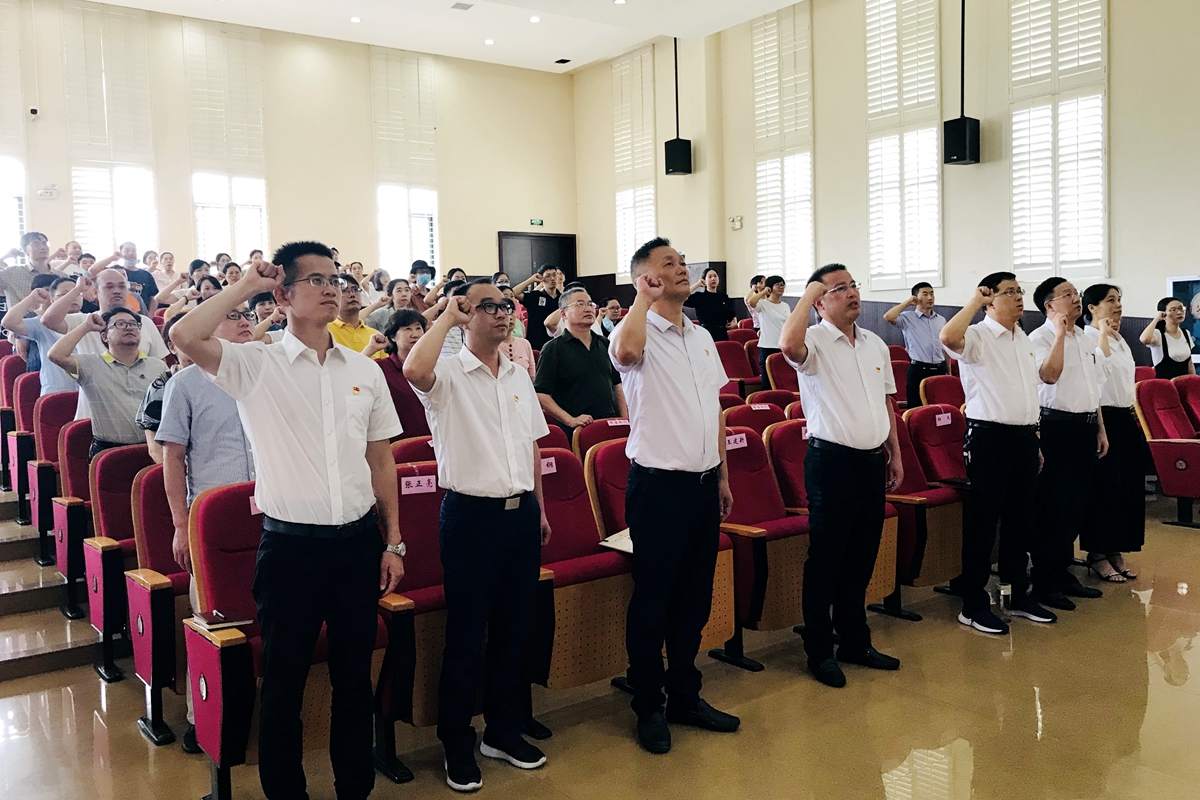 “我志愿加入中国共产党,拥护党的纲领,遵守党的章程……”会前,与会党员教师集体宣誓,重温入党初心。