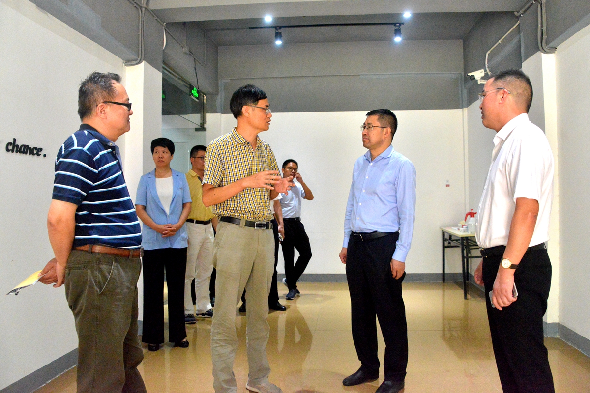 在学院创业学院,蒋校长一行实地参观了创新工场二期场地,先后考察了创业培训室、模拟训练室以及路演厅、开放式工位等,创业学院负责人池水明介绍了创业学院的基本情况,重点汇报了众创空间的发展历史、运营模式、取得荣誉及项目入驻情况,同时还介绍了孵化成功的学生创业项目案例以及近几年创业学生积极参与上财本部匡时班情况。