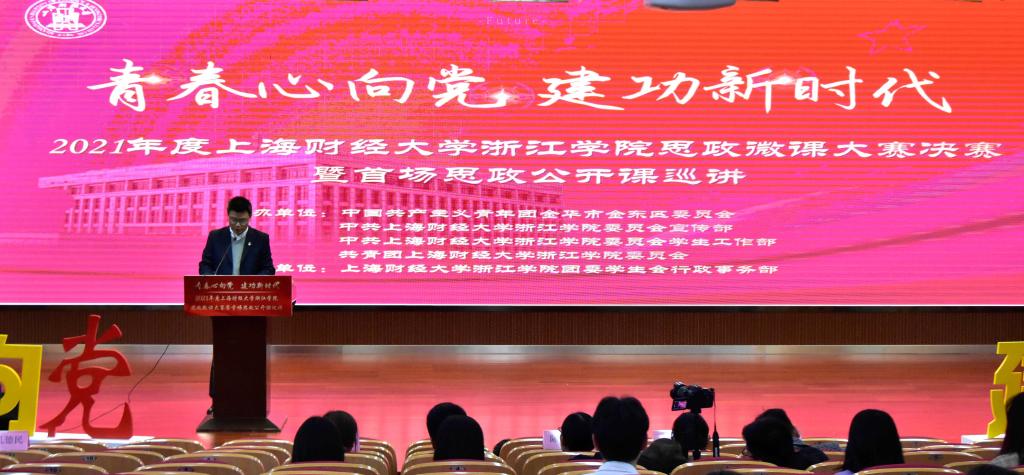 3月25日,由团金东区委、院党委宣传部、院党委学工部、院团委共同主办的2021年度学院思政微课大赛总决赛暨首场思政公开课巡讲活动在图书馆报告厅举行。团金东区委副书记王傲雪、学院党委副书记孔德民、党委委员郑伟俊亲临决赛现场观摩指导,学院相关职能部门负责人、各系学工办主任、全体辅导员及学生代表等共计300余人观看了比赛。