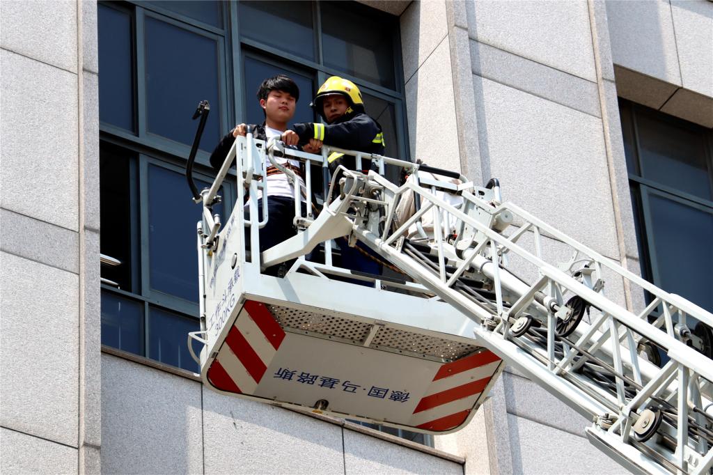 12时30分,学院党委书记王建新下令演练开始。顷刻间,现场“浓烟四起、警铃大作”,工作人员发现警情后立即向校保卫处和119报警,校内消防队伍迅速带上灭火器材赶赴起火地点进行扑救。与此同时,学生在疏散引导员的指引和带领下按要求迅速有序撤离。随后,防火卷帘门等自动化消防设施启动,“火灾现场”进一步得到有效控制。此时,绝大多数同学都在第一时间被疏散到安全场所,但高楼层仍有被困人员等待救援,消防队员迅速组织救援行动,现场指挥人员通过监控定位人员位置并发送给消防队员,消防队员精准快速地实施了搜救。通过紧张的救援,消防人员用担架成功将被困学生救出,外部云梯消防车也将被困高楼层的两名学生救出。