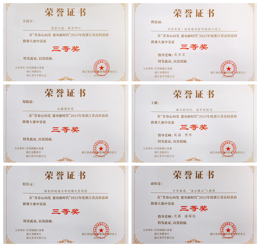 在此次大赛中,我院团委精心选拔、组织指导、反复打磨,共推荐了5名青年教师、5名青年学生参赛。最终,会计系报送的程佳元老师《新农村迎来大学生理论宣讲团》、经济与信息管理系报送的郑路倩老师《红船再出发》、外语系报送的方晨宇老师《追望大道,探求初心》等3个作品获教师组三等奖;统计系报送的傅思涵同学《功成有我!把青春写在中国的大地上》、金融系报送的俞怡霏同学《少年执笔,“金山银山”入画来》、会计系报送的王聃同学《奋斗新时代,青年有担当》等3个作品获学生组三等奖。