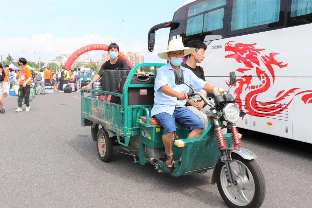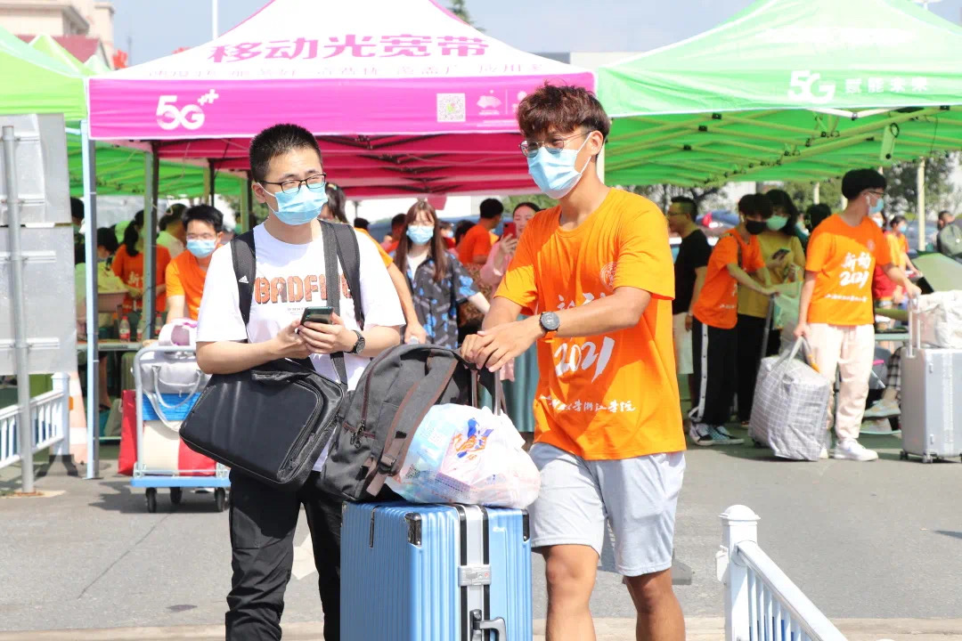 为做好疫情防控要求下的新生迎新活动,学校提前做好了全方位的部署,各部门严阵以待,全力做好迎新保障工作。学校在金华高铁站和金华高铁南站都设置了接站点,迎新志愿者也早早的在此等候,随后一辆辆大巴车将新生送往学校。校内也安排行李托运志愿者及摆渡车帮助新生将行李送到寝室。此外校园内还有随处可见的凉亭,为学生提供绿豆汤等防暑饮品。