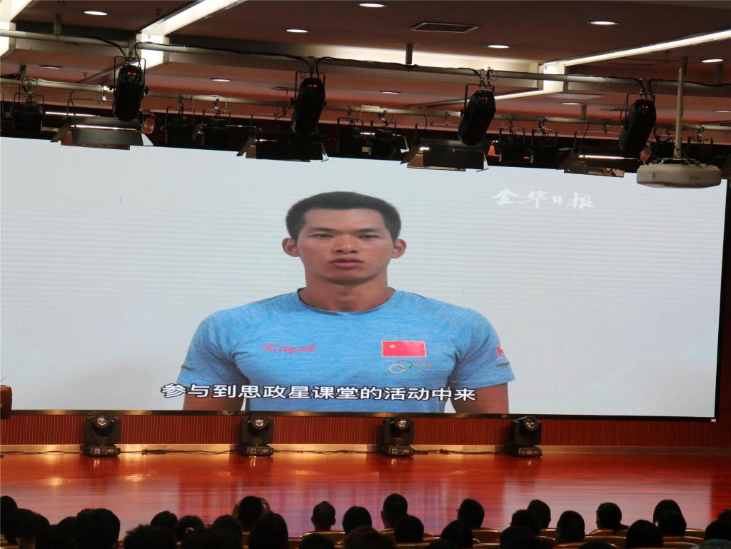 活动现场,金华籍奥运健儿王丛康以短视频的方式寄语大一新生,希望全体新生能勤奋读书,努力奋斗,勇敢前进,不断靠近并实现自己的理想。