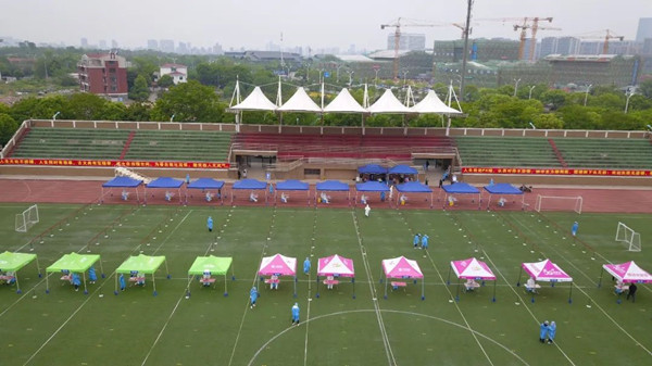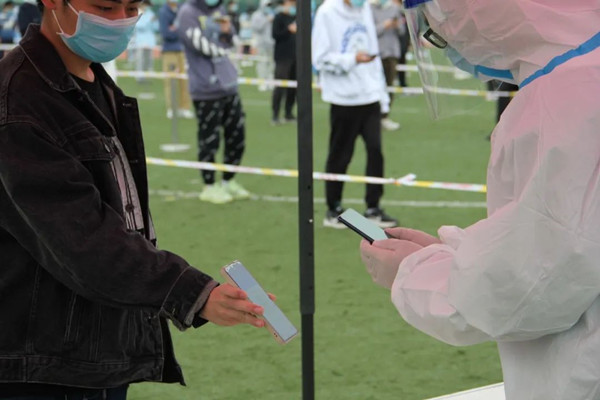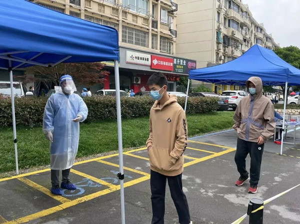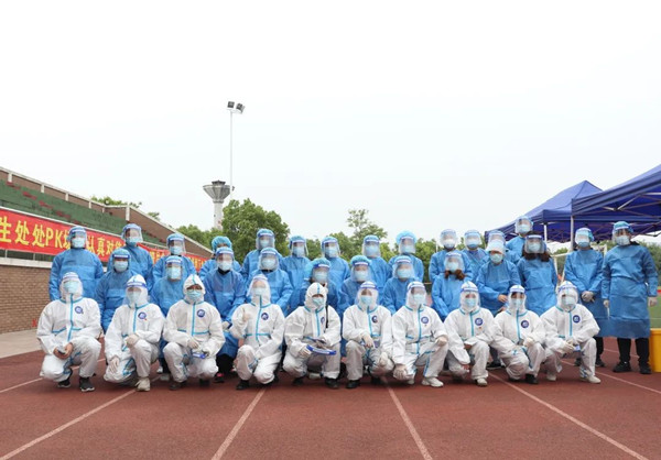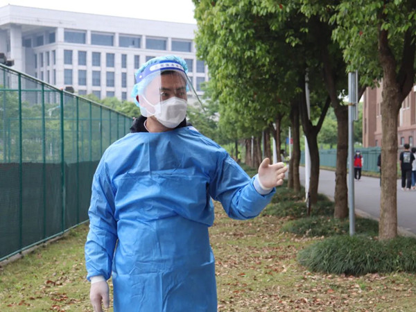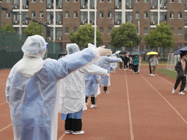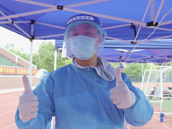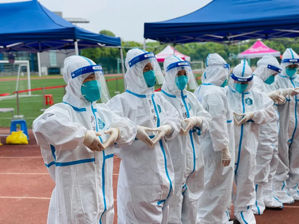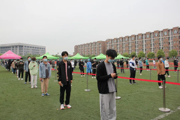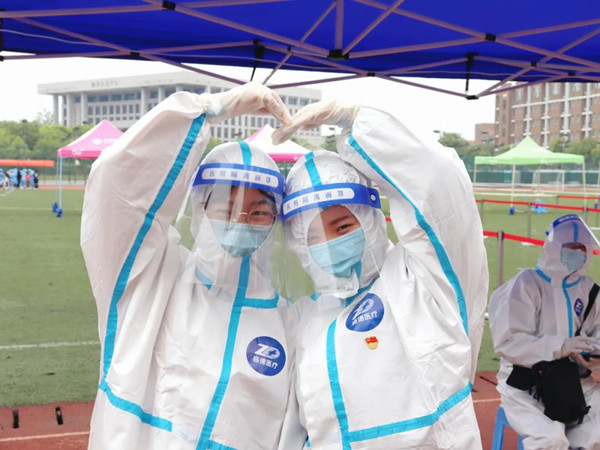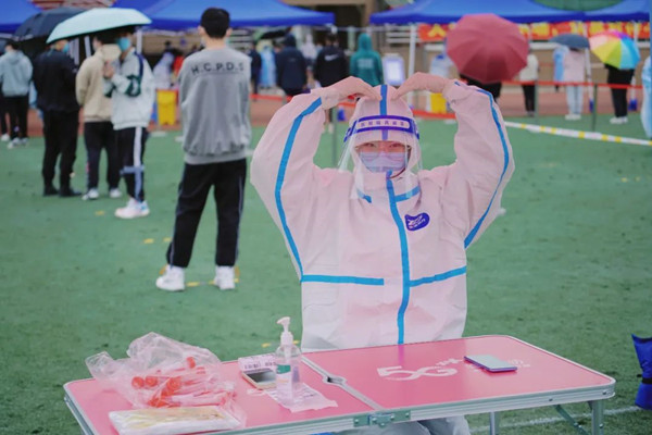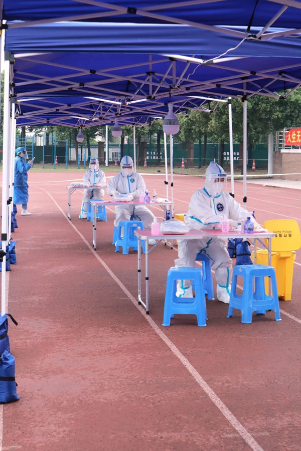 校内师生自发报名参与防疫志愿,汇聚志愿力量,扛旗争先,勇担使命,化身“大白”和“蓝朋友”,穿梭在各个楼宇、入口、出口,钻进每位待测师生的眼里和心中。