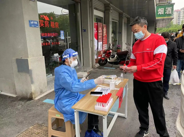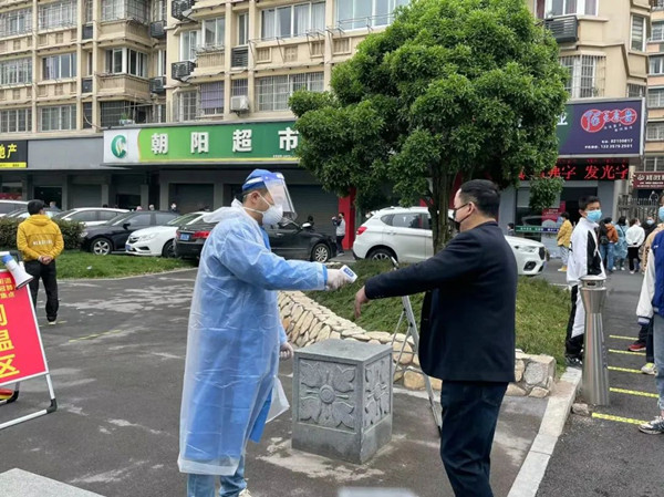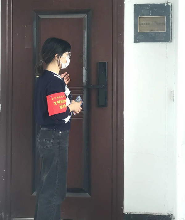 外语系教工支部叶丽芳老师前往江南街道兴学社区进行扫楼,挨家挨户通知核酸检测。