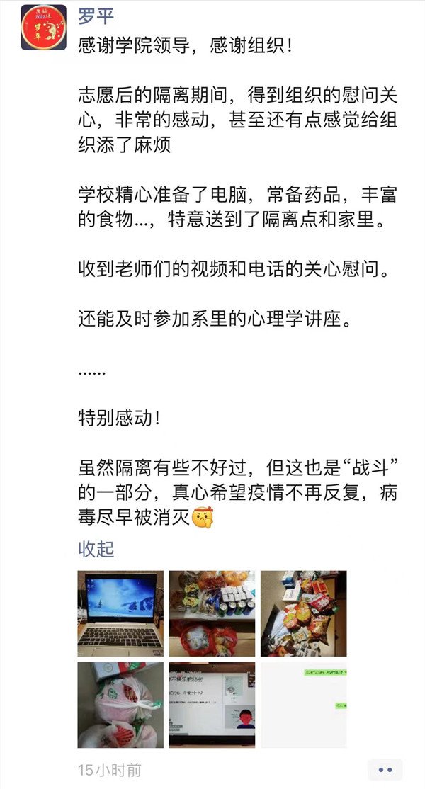 学院领导的慰问和关心让罗平老师倍感温暖和鼓舞,罗平老师表示:“非常感谢学院领导的关心,我认为这一切都是应该的。接下来我一定会再接再厉,在做好本职工作的同时,积极响应党和国家的号召,为早日打赢疫情防控歼灭战,贡献自己的一份力量!”