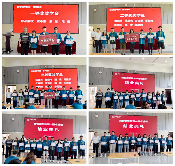 在随后举行的首期卓越班结业典礼上,马洪表示,数智商学院卓越班将创新创业能力、职业素养和人文素养融入教学,有助于提升学生数智化业务思维能力、数智化战略分析能力、数智化流程优化能力,希望全体学员在未来学习和职业道路上开拓创新、奋发进取,不断锤炼专业技能,为产业数智化转型贡献力量。刘曙光表示,此次卓越班结业是是深化校企合作新起点,相信通过双方紧密合作,必将在应用型本科建设、双师型教师培养、精品课程与教材开发、学生高质量就业等方面取得丰硕成果,希望同学们将所学、所获付诸实践并带入职场,以优异的学习成绩和扎实的业务功底助力企业发展。马洪和刘曙光分别代表校企双方签订共建校内外实践教学基地协议并为基地揭牌。典礼上还表彰了首期卓越班奖学金获得者,校企领导为学生颁发结业证书、荣誉证书并发放奖学金。
