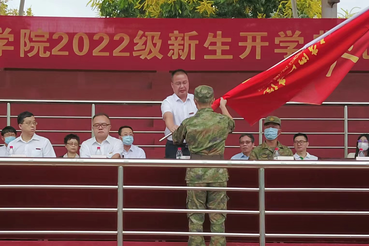 典礼最后,党委书记王建新向军训团授旗。