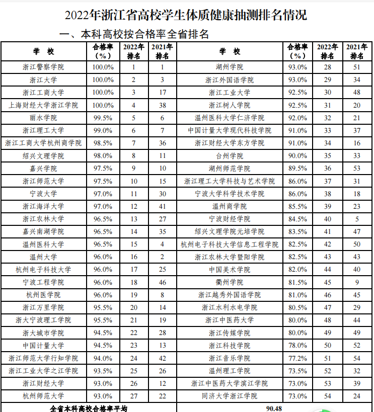10月26日,浙江省教育厅公布了今年5月进行的学生体质健康状况抽测工作成绩,我院学生体质健康抽测合格率为100%,是全省合格率100%的四所院校之一,在全省54所本科院校中合格率排名位列第4;抽测优良率为29.5%,在全省排名位列第13;抽测的合格率和优良率在全省18所独立院校中均位列第1。各项体测成绩和排名都有大幅度的提升,创历史新高。