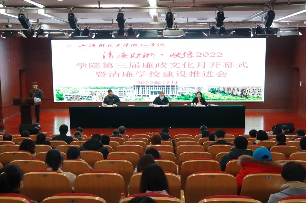 12月7日下午,学院在图书馆报告厅举行第三届“清廉财浙 映像2022”廉政文化月开幕式暨清廉学校建设推进会。学院领导班子,全体中层干部,综合办、学工办主任,专兼职纪检干部,师生代表等参加开幕式。市纪委常委、市监委委员徐燕应邀莅临现场指导,学院党委书记王建新讲话,开幕式由学院纪委书记陈钢主持。
