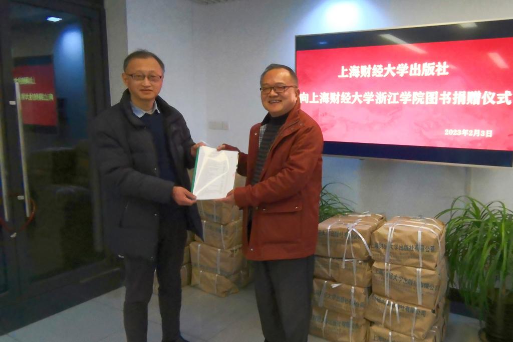 慷慨捐书,以资后学,社校融合,筑梦未来。近日,上海财经大学出版社向学院捐赠图书一千余册,价值近7万码洋。捐赠仪式在上海财经大学出版社举行,上海财经大学出版社董事长、总经理、总编辑黄磊,上海财经大学浙江学院院长马洪等人参加捐赠仪式,院长马洪代表学院接受赠书。