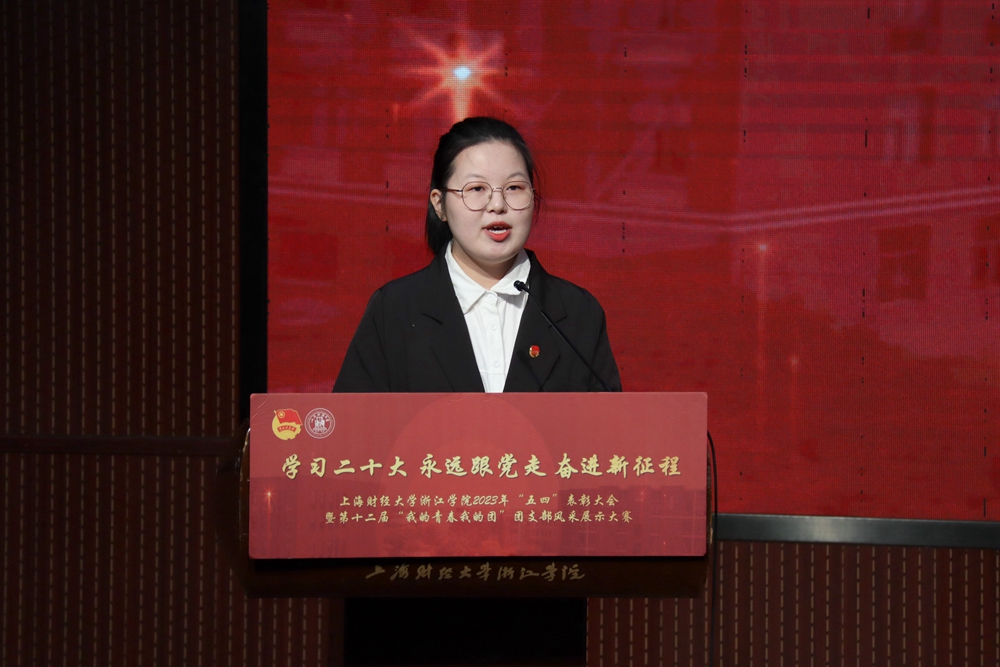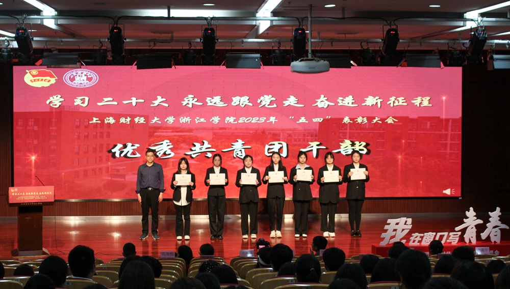 曾惠成宣读了《关于2022-2023学年上海财经大学浙江学院“五四”评优表彰决定》文件,大会为获得“五四红旗团支部”“五四青年标兵”等荣誉称号的先进集体和个人进行了颁奖。“优秀共青团干部”获得者代表陈心仪同学作了交流发言。