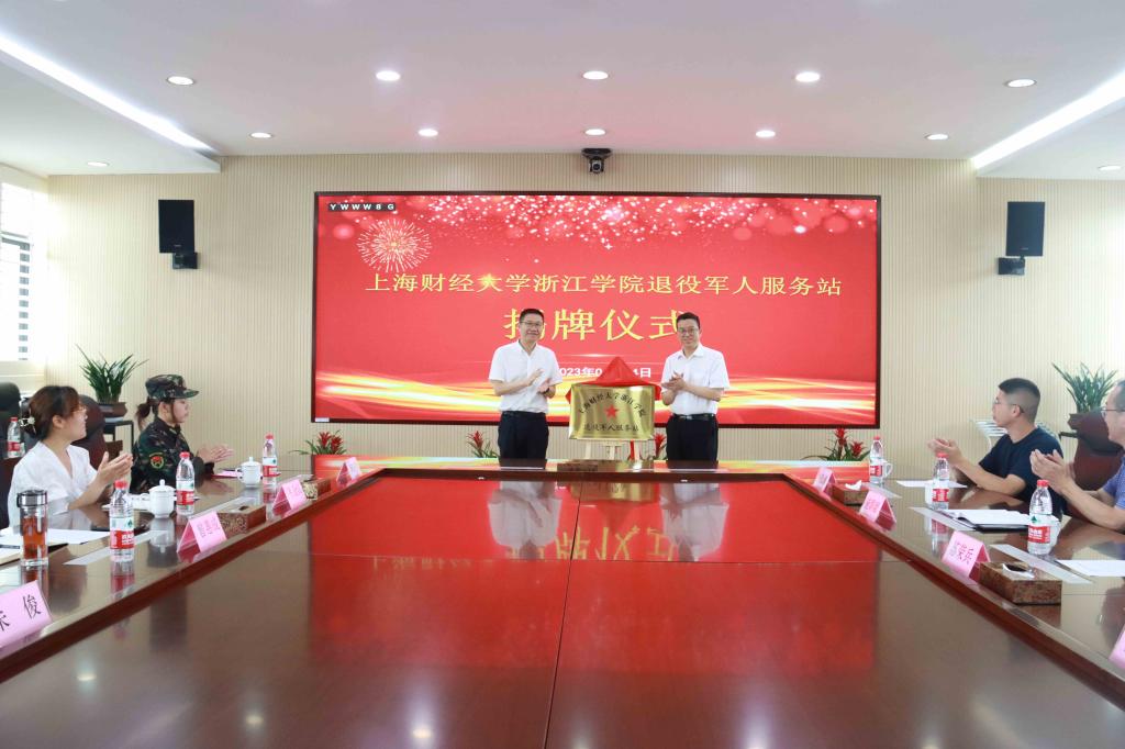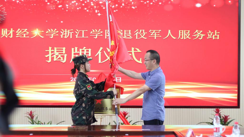 苏荣兵和曾惠成共同为“上海财经大学浙江学院退役军人服务站”揭牌,施群献为“上海财经大学浙江学院退役军人志愿服务队”授旗。