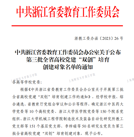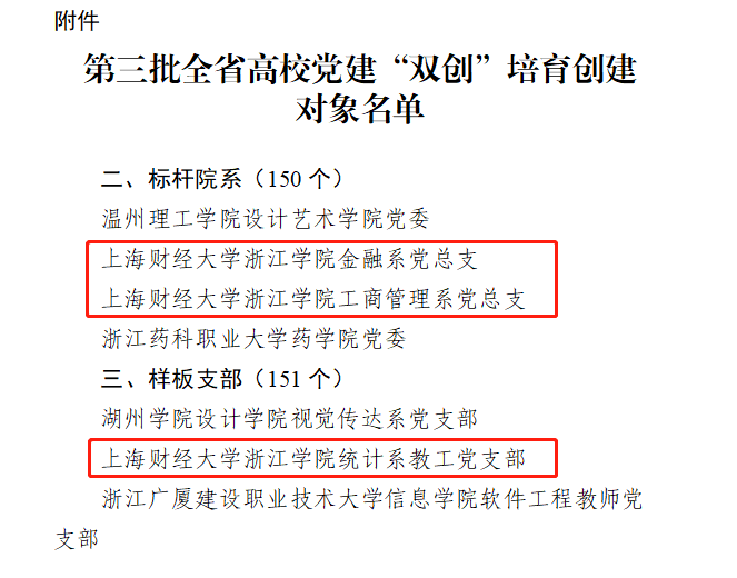 近日,中共浙江省委教育工委公布了第三批全省高校党建“双创”培育创建单位名单,我院金融系党总支、工商管理系党总支成功入选全省党建工作标杆院系培育创建单位,统计系教工党支部成功入选全省党建工作样板支部培育创建单位。我院此轮入选数量位居全省独立学院首位,标志着学院党建工作取得又一省级突破性成果。