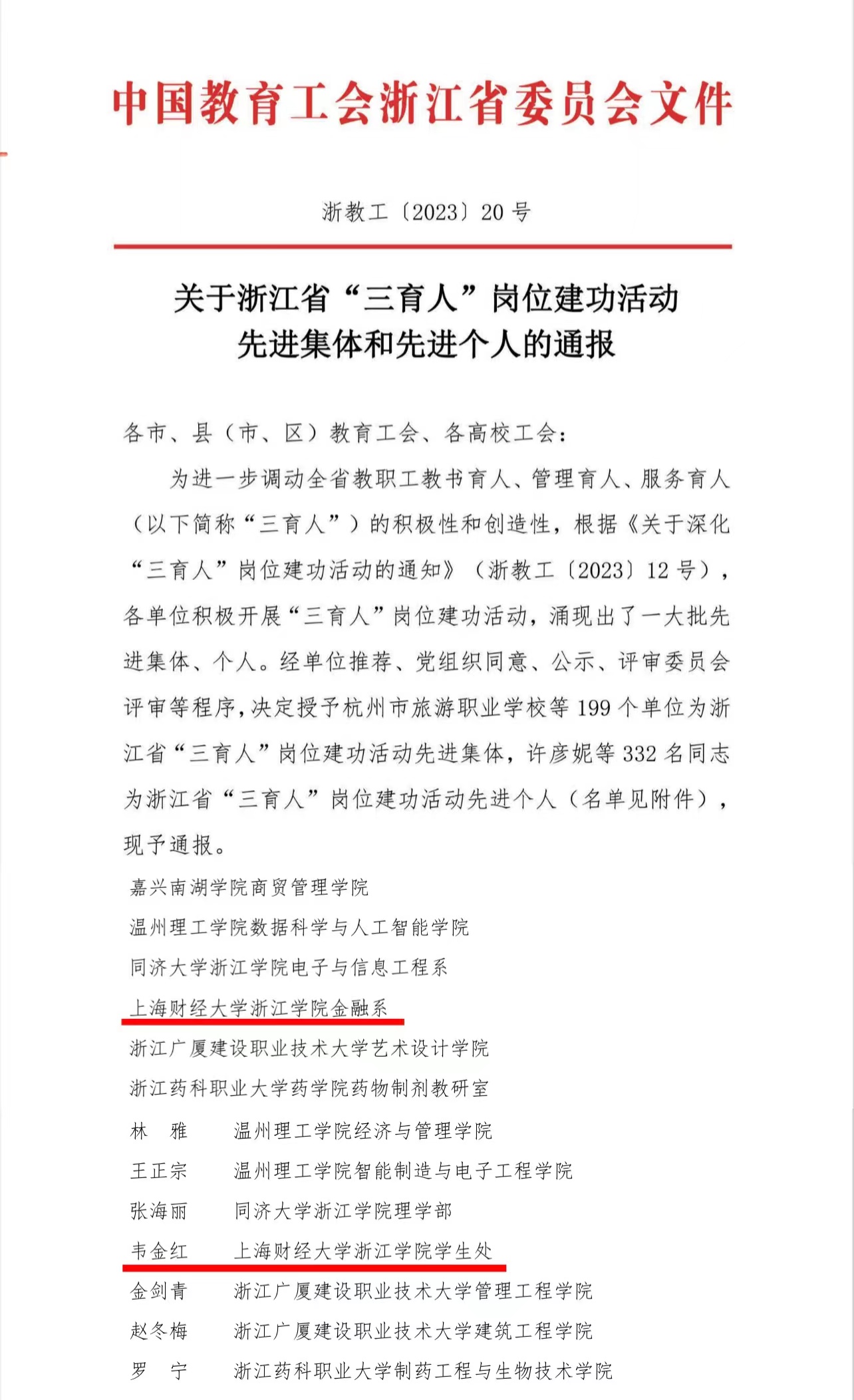 近日,由浙江省教育工会发布的《关于浙江省“三育人”岗位建功活动先进集体和先进个人的通报》中,我院金融系荣获浙江省“三育人”岗位建功先进集体,学生处韦金红老师荣获浙江省“三育人”岗位建功先进个人。