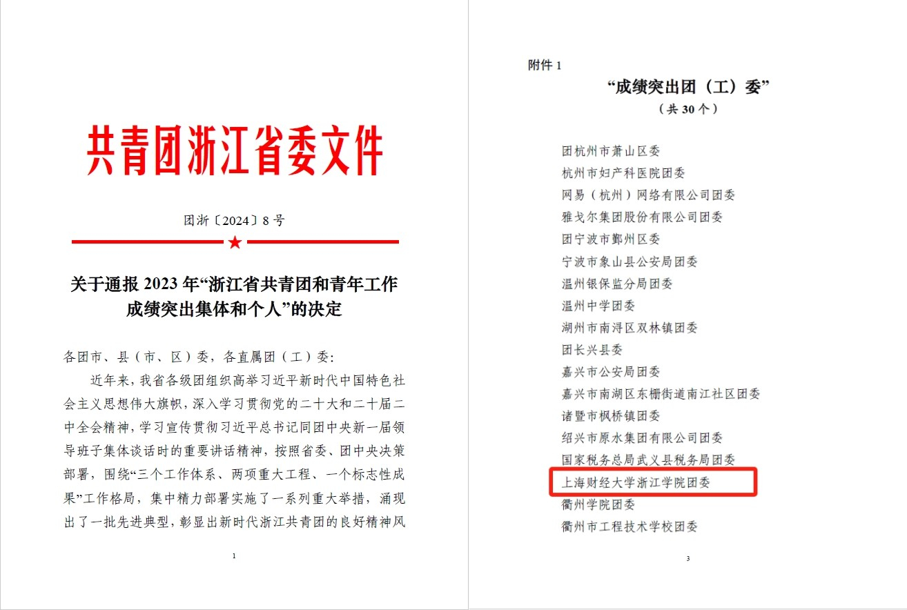 近日,为表彰先进、树立典型,进一步发挥典型示范引领作用,共青团浙江省委对2023年“浙江省共青团和青年工作成绩突出集体和个人”提出表扬。其中,上海财经大学浙江学院团委获评“浙江省成绩突出团(工)委”,全省共30个团(工)委获此殊荣。