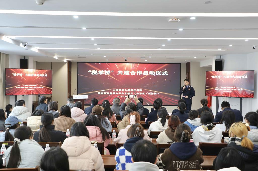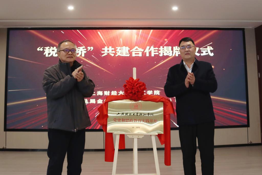 马洪和夏志坚为“上海财经大学浙江学院党建和思政教育实践基地”揭牌,邱风和陈瑛代表双方签署战略合作协议,双方相互颁发“税收资政员”和“就业创业导师”聘书。