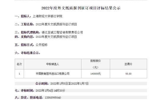 【结果公告】2022年度外文纸质报刊征订项目评标结果公示
