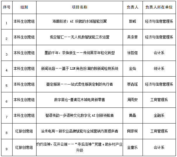 根据浙江省国际大学生创新大赛(2025)工作通知,我院各系部全面发动、认真准备参赛作品,经初赛筛选评审、校内决赛及专家评审,拟推荐以下9个团队项目代表我院参加浙江省国际大学生创新大赛(2025)省赛,现予以公示如下: