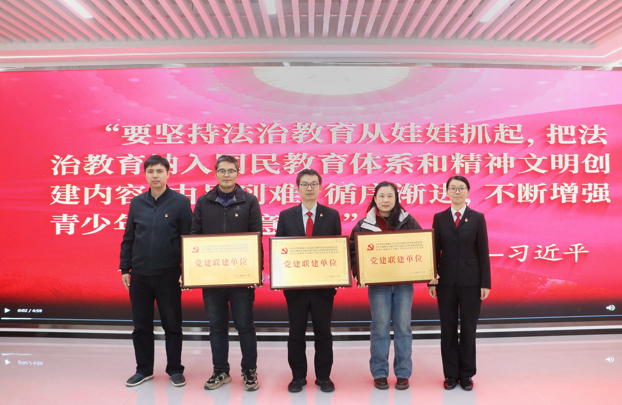 为进一步推动普法教育和思政教育融会贯通一体推进,加强普法教育常态化、思政教育多样化,提升党建引领作用,婺城区人民法院白龙桥人民法庭党支部与马克思主义学院直属党支部、外语系学生党支部就党建联建合作达成意向。杨喆俊为党建联建单位授牌并合影。