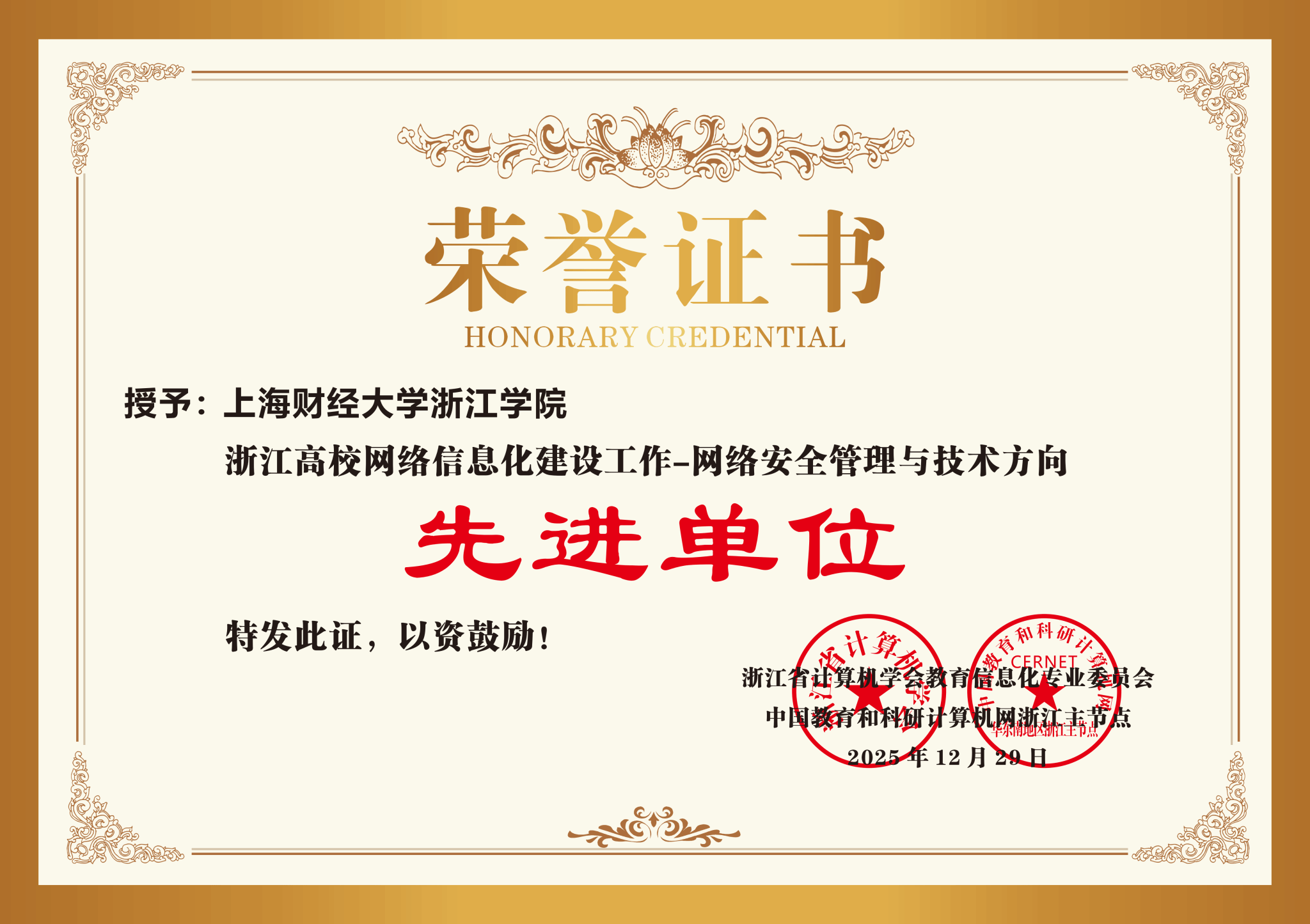 12月29日,浙江省计算机学会、中国教科网浙江主节点公布了“浙江高校网络信息化建设先进单位”名单,我院再次成功获评。教育技术中心华多老师成功获评“浙江高校网络信息化先进个人”。