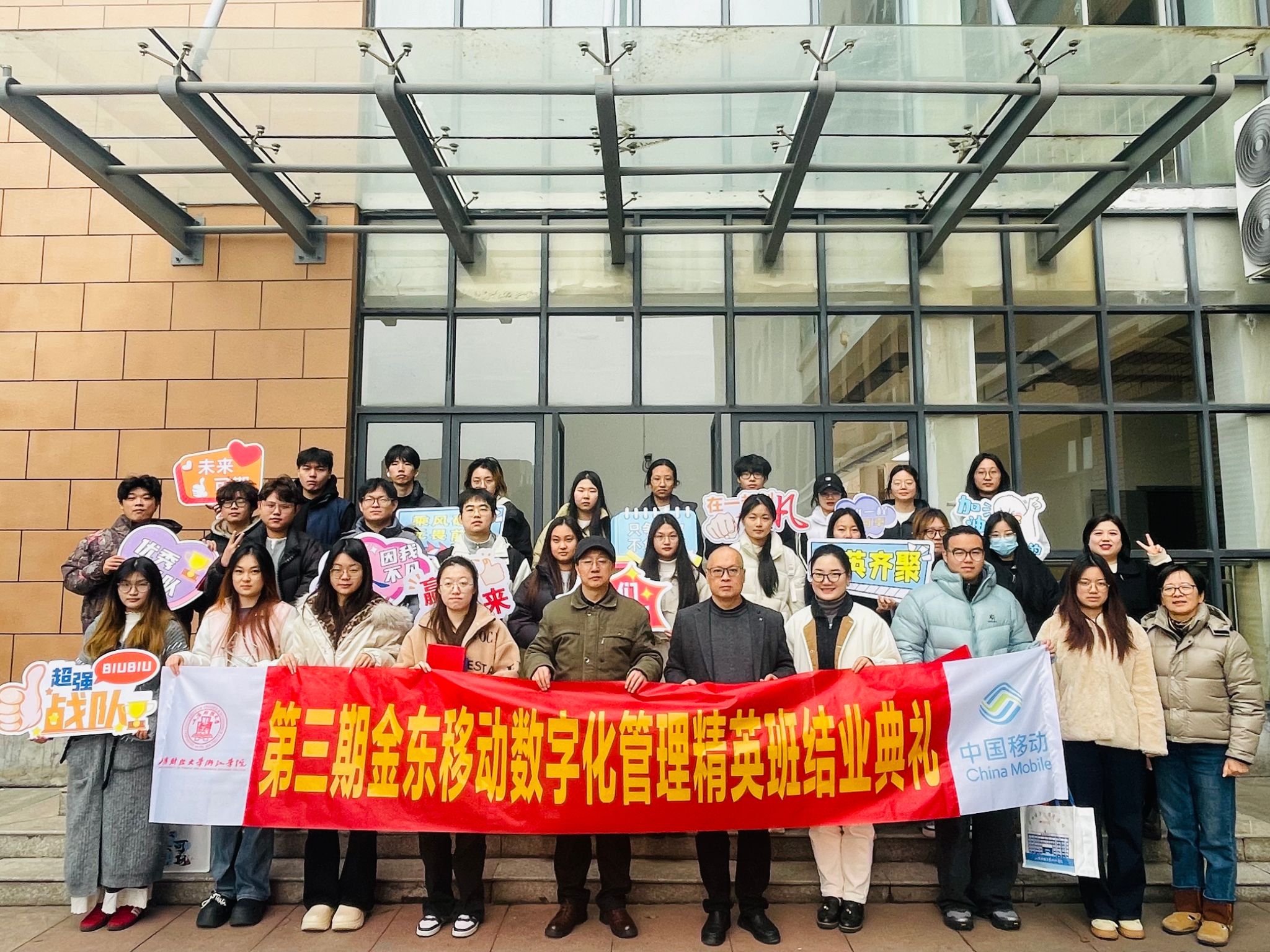 1月6日中午,金东移动数字化管理第三期精英班结业典礼在教学楼6幢106教室顺利举行。中国移动通信集团浙江有限公司金东分公司总经理余殷、副院长邱风,金东移动数字化管理第三期精英班全体学员等相关人员参加本次结业典礼。