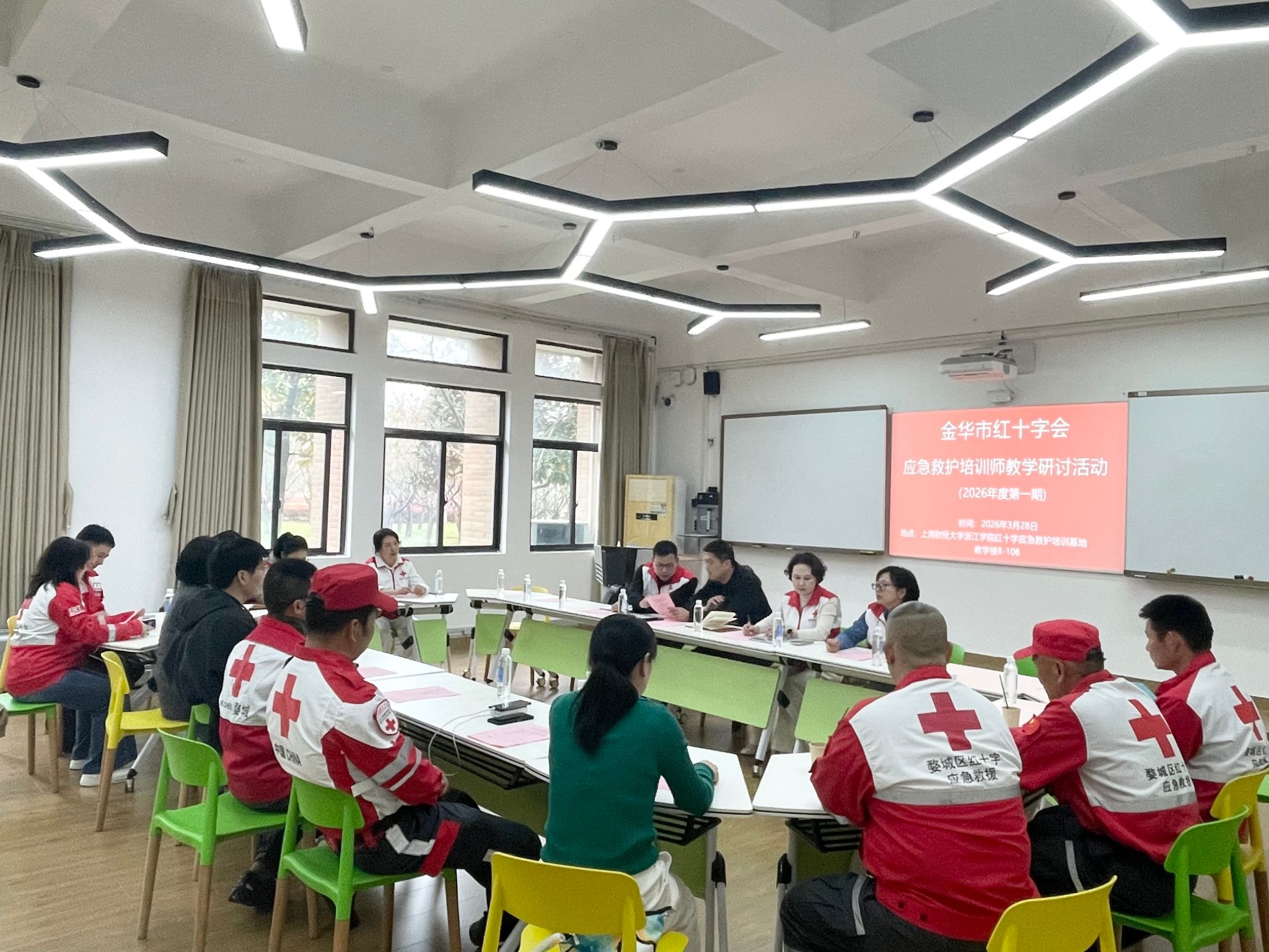 3月28日,由金华市红十字会主办,学校红十字应急救护培训基地承办的2026年度第一期应急救护培训师教学研讨活动在我校举行。金华市红十字会、县(市、区)红十字会领导及工作人员、省红十字会一级救护师以及全市应急救护培训师代表参加。