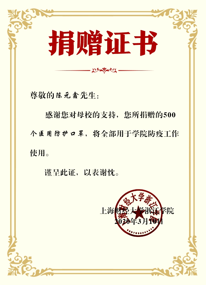 2018届校友陈元鑫利用在海外从商的便利条件助力家乡广西北海疫情防控,采购到15万只医用口罩和一大批防护服、护目镜、测温仪全部发放到防疫一线,部分捐赠给红十字会,留下的500个医用口罩捐赠给了母校。他表示,作为一名财浙学子,非常怀念在财浙学习、生活的时光,感恩学院多年的培养,得知学院防控物资紧缺,特意捐赠500个医用口罩,希望能为母校的疫情防控工作助力。张正亮代表学院向陈元鑫校友表示感谢,并向他在线颁发了电子捐赠证书。