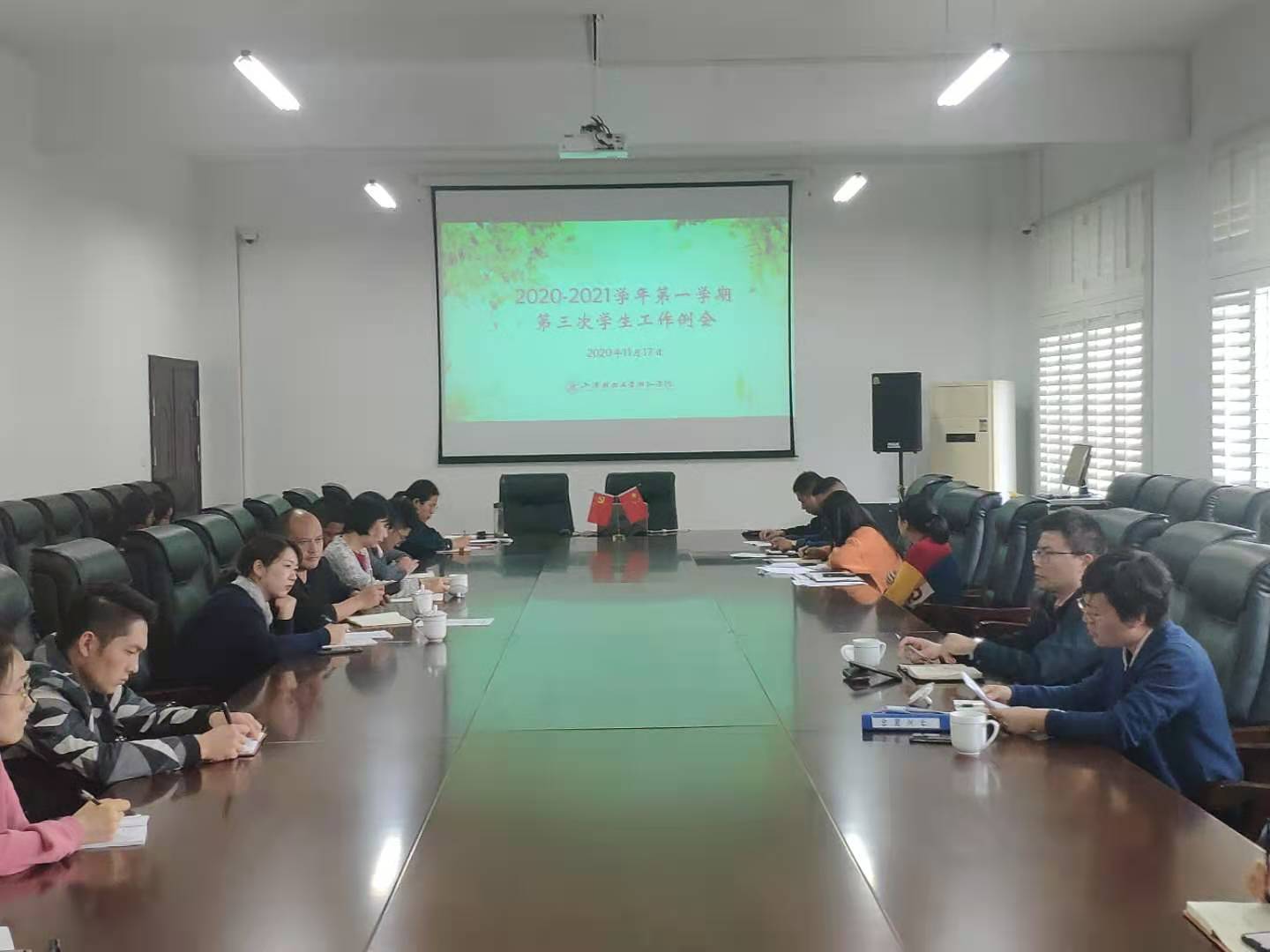 为贯彻落实学院2020年党政工作要点,查漏补缺,确保顺利完成本年度学生工作目标,11月17日下午,学院在28幢308召开2020-2021学年第一学期第三次学生工作例会,党委副书记孔德民出席,各系总支副书记、学工办主任、全体辅导员及学生处全体人员参加会议,会议由学生处负责人主持。