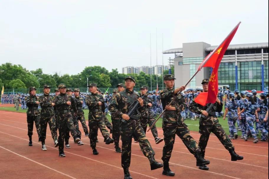在雄壮的国歌声中,国旗徐徐升起,军训汇报表演正式拉开帷幕。