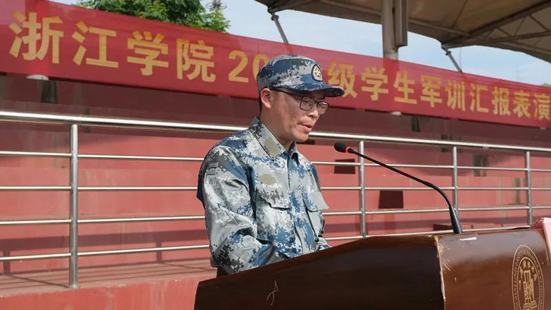 孔德民代表学院向金东区人武部领导、全体教官表示由衷感谢,向以优异成绩通过军训这门必修课的全体2020级学生表示热烈祝贺。孔德民表示,学生们在军训期间不仅以教官为榜样,坚韧不拔、刻苦训练,同时在雨天时能自律自觉参与观看庆祝中国共产党成立100周年大会直播、红色电影等活动,用自己的形式庆祝中国共产党成立100周年。最后,孔德民向全体2020级学生提出三点希望:一是希望同学们心怀梦想、志存高远,做有理想和有信念的有志青年;二是希望同学们不负韶华、创新不止,做有能力和有学识的追梦青年;三是希望同学们坚韧不拔、砥砺前行,做有责任和有担当的实干青年。
