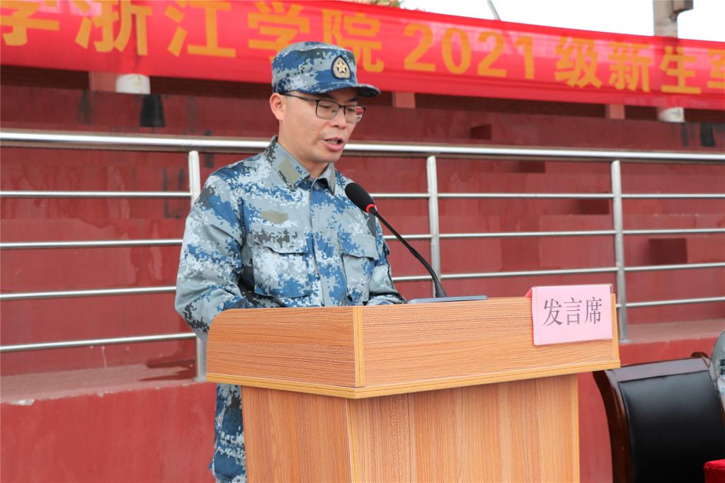 孔德民作军训动员讲话,他首先代表学院全体师生向新同学们表示热烈欢迎,向前来指导军训工作的金东区人武部领导和承训的全体教官表示诚挚的感谢。他表示,军训是大学阶段的必修课,通过军训可以磨炼“铁一般信仰、铁一般信念、铁一般纪律、铁一般担当”的素质。“今年是中国共产党成立100周年,也是“两个一百年”的历史交汇期,如何把同学们培养成为担当民族复兴大任的新时代合格建设者和接班人,是我们共同面对的时代课题,也是我们责无旁贷的历史责任。希望通过军训能够帮助同学们树牢军人意识和家国情怀,不断提高意志和情操”。最后,他对全体新生提出三点要求:一要增强爱国精神,强化国防意识,认真学习人民军队听党指挥的坚定立场和敢于胜利的精神品质;二要做到百炼成钢,强国有我,在刻苦训练中磨炼意志,切实激发爱国之情和报国之志;三要严守纪律规矩,养成良好作风,树立纪律意识和规则意识,在实现中华民族伟大复兴中国梦的实践中谱写精彩的青春华章。