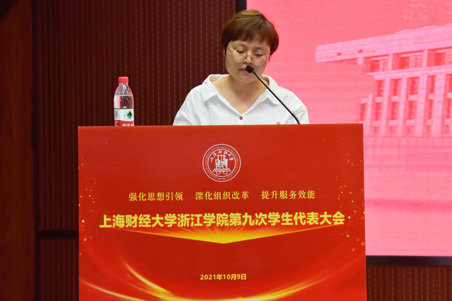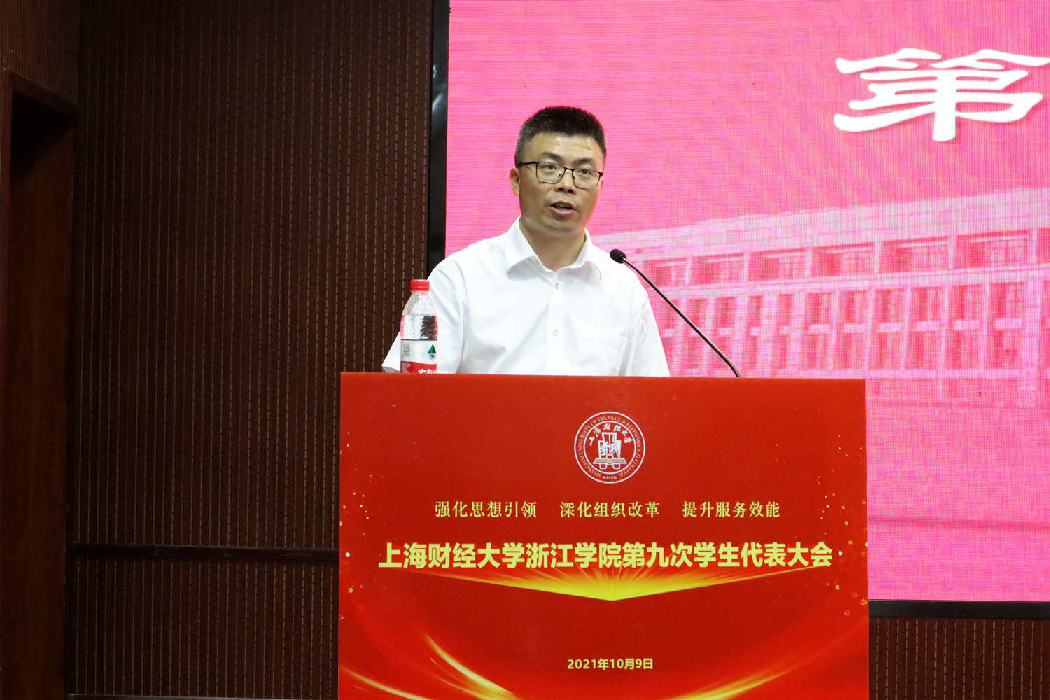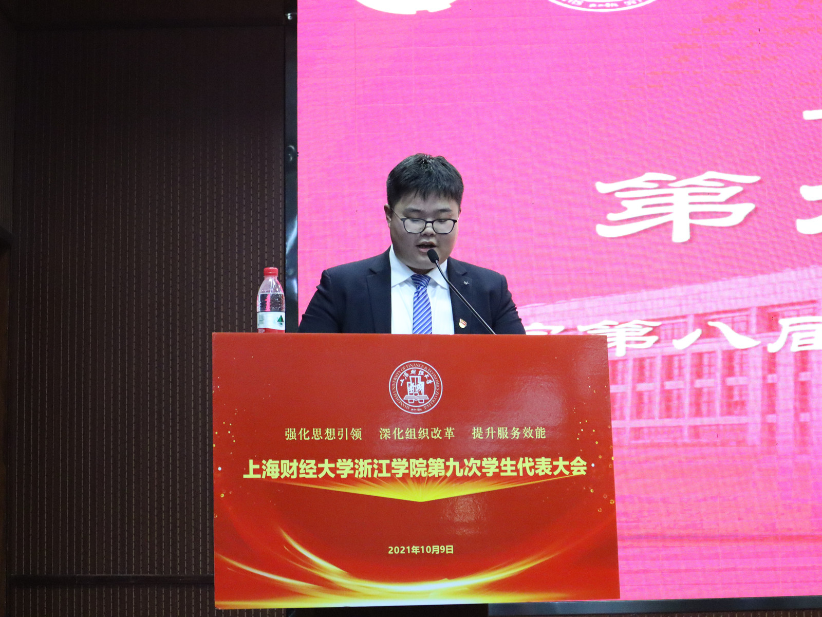 10月9日,学院第九次学生代表大会在图书馆报告厅召开,院党委副书记孔德民,院党委学工部负责人韦金红,金华市学生联合会执行主席林浩,团委及各系团总支负责人出席开幕式。来自全院各系的学生代表共计104人参加了会议。