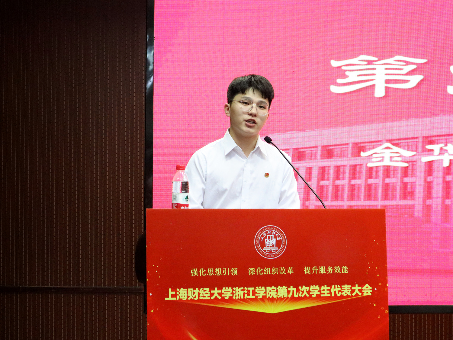 金华市学生联合会驻会执行主席林浩代表市学联在大会上致辞。他提出学生会组织要强化思想政治引领,引导学院青年学生坚定地跟党奋斗,以全心全意服务同学为宗旨,用实际行动强化服务意识。