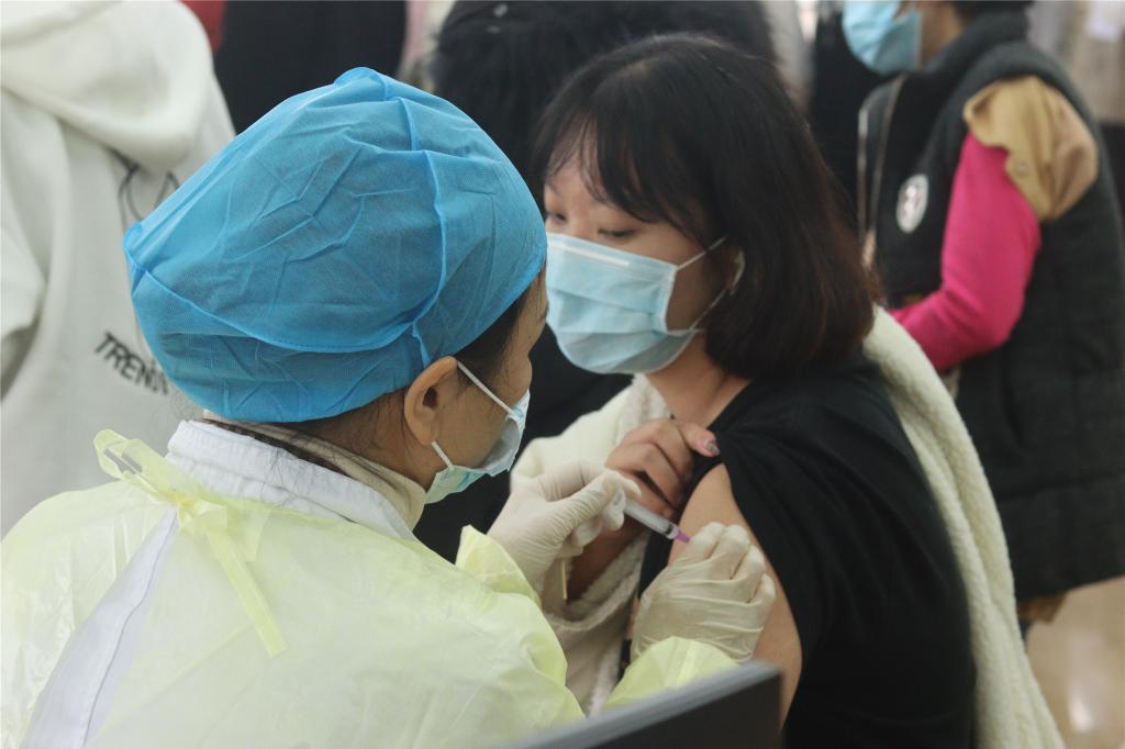 志愿者在现场维持秩序并引领待接种人员到指定地点接种。