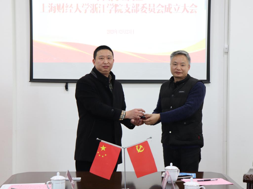 民盟金东区总支副主委黄利林宣读《关于成立民盟上海财经大学浙江学院支部的决定》,洪铁松同志当选为支部主委,郑拯同志为支部组织委员,黄哲同志为支部宣传委员。黄利林向新当选的支部主委洪铁松授章。