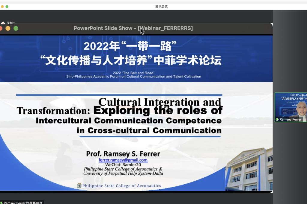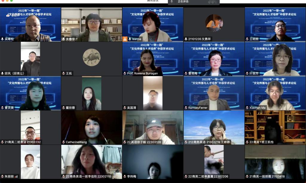 11月26日,由我院外语系与国际交流处共同主办、马克思主义学院协办的的2022年“一带一路”中菲学术论坛在云端举行。本次论坛以“文化传播与人才培养”为主题,紧紧围绕学习贯彻党的二十大报告提出的推进文化自信自强,铸就社会主义文化新辉煌的战略部署,旨在扩大中菲高等教育交流与合作,推进中外人文交流,深化“一带一路”国家文化传播与人才培养交流,提升中国文化国际传播力,加强高素质文化人才培养,为我院师生搭建提高跨文化交际能力、培养创新意识和国际化文化素养的学习平台。