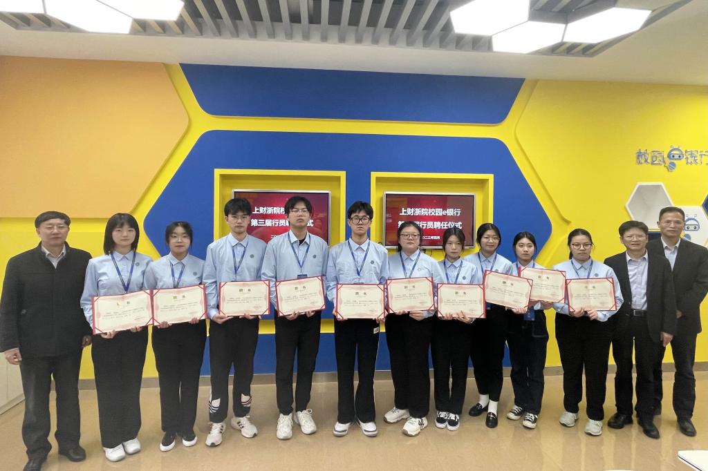 4月13日中午,学院举行了上财浙院校园e银行第三届行员聘任仪式。学院副院长邱风,实践教学中心、校企合作处主任朱艳及相关人员,中国建设银行金华分行副行长卢根喜和营业部副总经理朱益铨,校园e银行第三届行员参加了本次聘任仪式。仪式由朱艳主持。