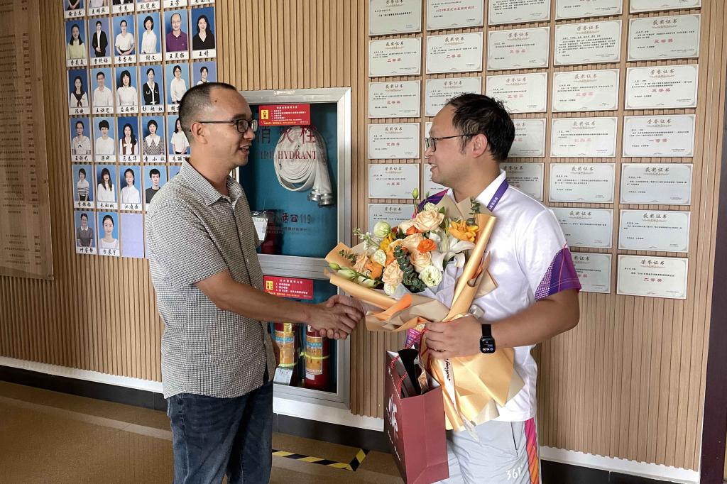 张正亮首先对吴峰松老师响应金华市委、市政府的号召,积极参与亚运专班工作表示了赞赏,对他高质量完成有关亚运相关工作的同时,牺牲周末时间来完成教学任务的负责态度给予高度认可。随后,张委员详细了解了吴老师在亚运专班工作的情况,家里老人小孩情况,对他最近生病住院、带病坚持工作表示关切,嘱咐他在面临高强度的亚运工作的同时,一定要注意身体。接着,张正亮为吴峰松老师送上鲜花和教师节礼物。