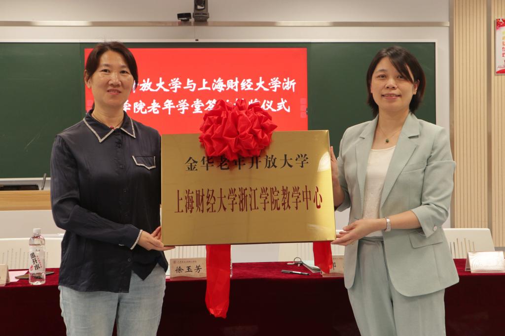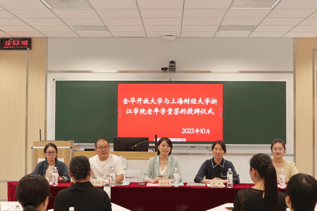 在上述签约的基础上,经双方协商,学院还增挂了上海财经大学浙江学院老年学堂。继续教育学院负责人,金华社区大学、金华老年开放大学以及30余名金华老年开放大学学员参加了上述活动。