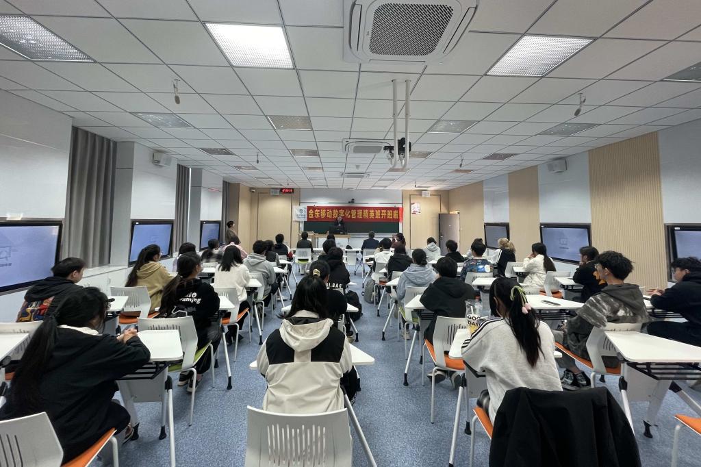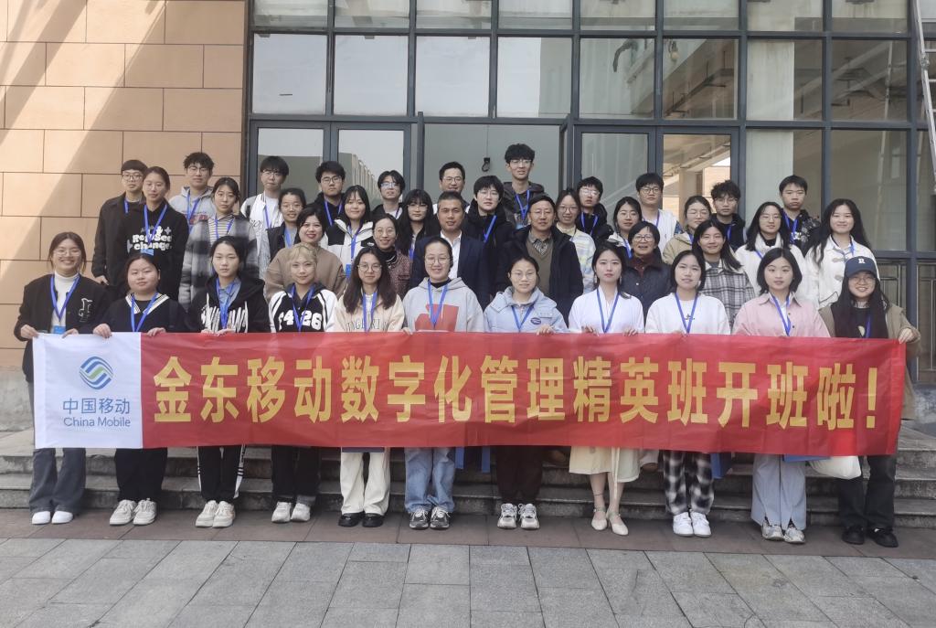 学院副院长邱风、中国移动通信集团浙江有限公司金东分公司总经理林金华出席开班仪式,中国移动通信集团浙江有限公司金东分公司市场部经理于淑平、校园经理方倩,实践教学中心主任朱艳,金东移动第二期数字化管理精英班全体学员参加。