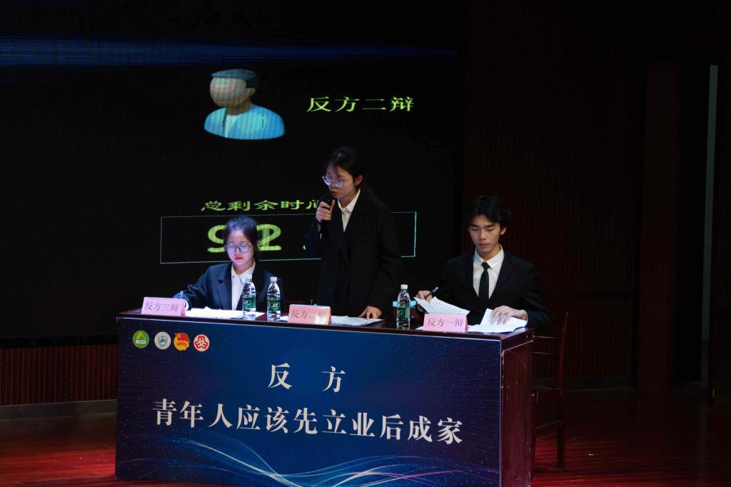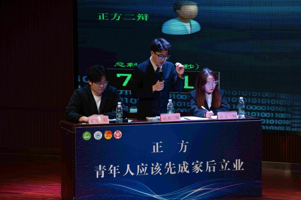 “立业没有大家想得那么容易,先成家对于大多数当下的青年来说更现实,如果已经有足够谋生的收入,为什么不先选择成家?”“不立业何以养家,不养家何以糊口,不糊口何以谈幸福?没有物质支撑的爱情是一盘散沙,对的人会站在你的前途里等你。”当天上午,浙江师范大学、金华职业技术学院、上海财经大学浙江学院、浙江金华科贸职业技术学院四支代表队出战,分别围绕“结婚是否应该门当户对”“没有钱要不要生孩子”等紧贴现实生活的主题展开激烈的辩论。经过初赛角逐,金华职业技术学院、上海财经大学浙江学院脱颖而出进入决赛,针对“青年人应该先成家还是先立业”的辩题展开了一场精彩辩论。比赛中,双方唇枪舌战、金句频出,输出一波波亮眼的观点,充分展示了大学生对婚育话题的思索和态度。