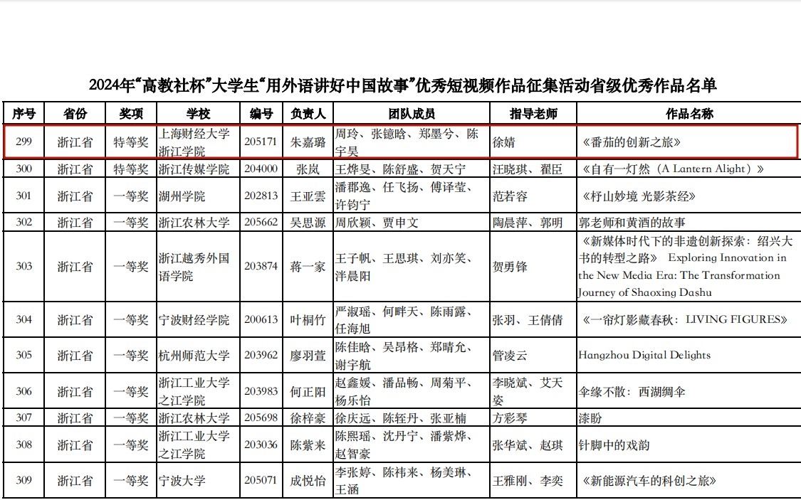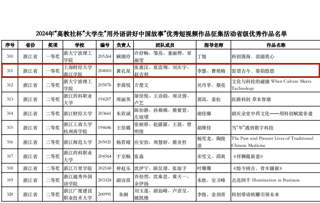 近日,2024年“高教社杯”大学生“用外语讲好中国故事”短视频大赛落下帷幕。我院学生朱嘉璐团队选送的作品《番茄的创新之旅》(指导老师:徐婧)获特等奖。黄孔星团队选送的作品《窑望古今,婺韵悠悠》(指导老师:李慧、曹艳梅)获一等奖。