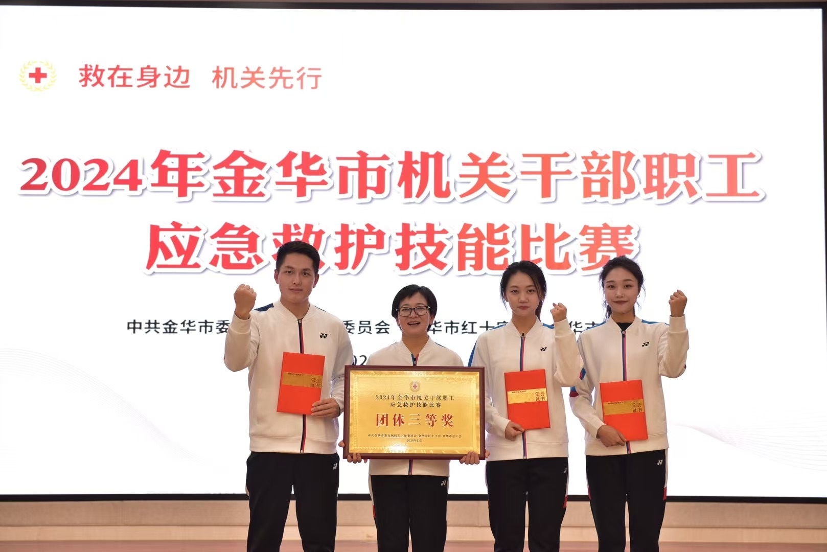 在深入推进“教在身边·机关先行”专项行动的背景下,金华市机关干部职工应急救护技能比赛于11月28日在市文化中心举行。此次比赛由市直机关工委、市红十字会、市总工会联合举办,旨在提升机关干部职工的应急救护能力,为构建安全和谐的金华贡献力量。在激烈的角逐中,学院的教职工代表队在比赛中取得佳绩,荣获团体三等奖。参赛队员李辉、方姿懿、苏嘉吉三位老师在比赛中展现了卓越的应急救护技能,以出色的表现获得了个人优秀奖。
