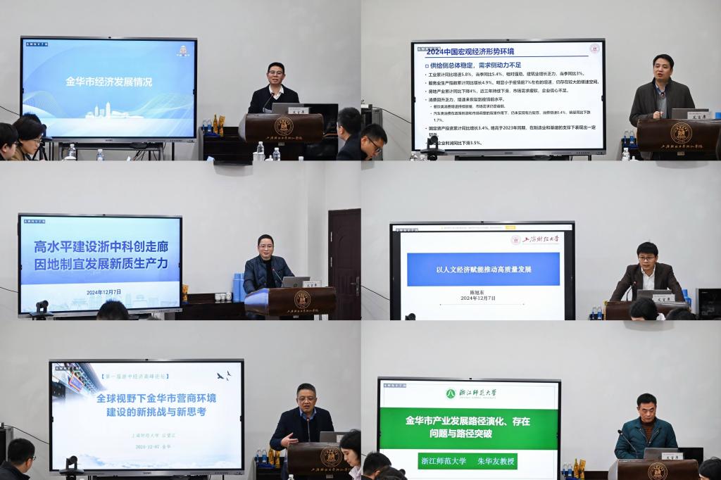 在论坛主旨报告环节,金华市发展和改革委员会副主任陈鑫伟从金华市经济发展情况切入,围绕经济总量、产业结构、三大需求、城市人口、居民收入、特色优势六个方面系统盘点了金华近20年来的经济发展情况,展现了金华经济转型成果,也透露出金华市发展规划,为未来发展指明方向。金华市科技局党组成员、综合协调处处长方黎明以“高水平建设浙中科创走廊,因地制宜发展新质生产力”为主题作报告,深入探讨了科创走廊的定义及其对地方发展的重要意义他强调要以科创走廊建设为契机,根据金华的资源禀赋和产业基础,针对性地发展新质生产力。为金华市科技创新和产业发展提供了清晰的方向和实施策略。上海财经大学经济学院党委书记林立国教授作了题为《进出口贸易结构变化趋势:金华的机遇与挑战》的主旨报告,他立足中国宏观经济形势环境,详细分析了进出口形势的变化以及出口结构的调整。他指出,国际贸易环境复杂多变,给金华市带来了诸多挑战。面对这样的外部环境,金华市需要积极应对,一是可以巩固自身的产业优势,继续发挥在特定领域的竞争力。二是积极培育新的增长点,通过创新和发展新兴产业,为进出口贸易注入新的活力。上海财经大学党委委员、图书馆馆长应望江教授作了题为《全球视野下金华市营商环境建设的新挑战与新思考》的主旨报告,他从全球视野出发,围绕“新理念、新体系、新特征、新挑战、新思考”五个维度,深入浅出地解析了金华市营商环境建设面临的全新形势,为金华后续优化营商环境、提振区域经济竞争力提供了宝贵思路与智力支撑。上海财经大学经济学院陈旭东副教授作了题为《以人文经济赋能推动高质量发展》的主旨报告,从人文经济内涵及其与高质量发展要求的契合、以人文经济赋能推动高质量发展的实践路径及金华发展人文经济的禀赋优势及其赛道选择三个方面展开,建议金华加快转变传统思维,持续思考以数字媒介和IP塑造为核心的城市文旅推广新观念、新思路、新方法,通过文旅场景的推陈出新不断满足人民群众对美好生活的追求,依托数字时代的“人人传播”,让城市从“出圈”变为持续“破圈”。浙江师范大学区域经济研究所所长朱华友教授作了题为《金华市产业发展路径演化、存在问题与路径突破》的主旨报告,朱教授开篇点明当下金华产业发展所处复杂背景,梳理金华市产业发展的整体概况,深度剖析金华重点产业发展路径的演变逻辑,厘清不同阶段产业布局调整、转型升级背后的驱动因素,针对金华重点产业“卡脖子”难题精准“开方”,提出一系列切实可行的发展策略,为金华重点产业未来高质量、可持续发展筑牢根基、明晰方向。
