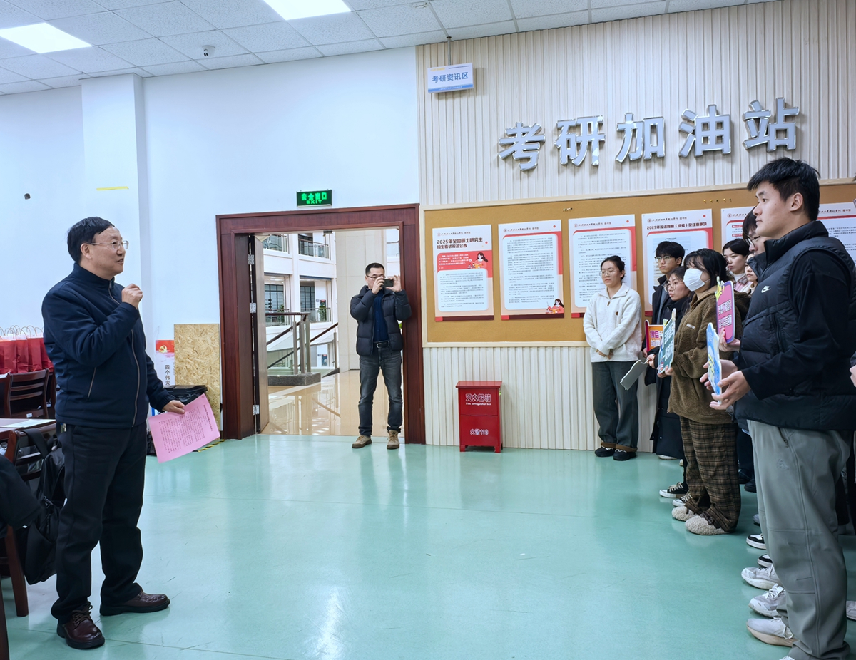 邱风与正在紧张备考的学子们亲切交流,他分享了自己的求学经历,鼓励同学们秉持三“心”精神:一要坚定决心,建立清晰的考研目标,坚持到底,笃学不倦;二要树立信心,加强自身的预期管理,调整心态,乐观积极;三是保持耐心,充分细致地做好准备,知己知彼,百战百胜。邱风代表学院为同学们送上了考前祝福,勉励大家以饱满的热情和坚定的信念投入到备考之中,争取在即将到来的研究生入学考试中考取心仪的学校。